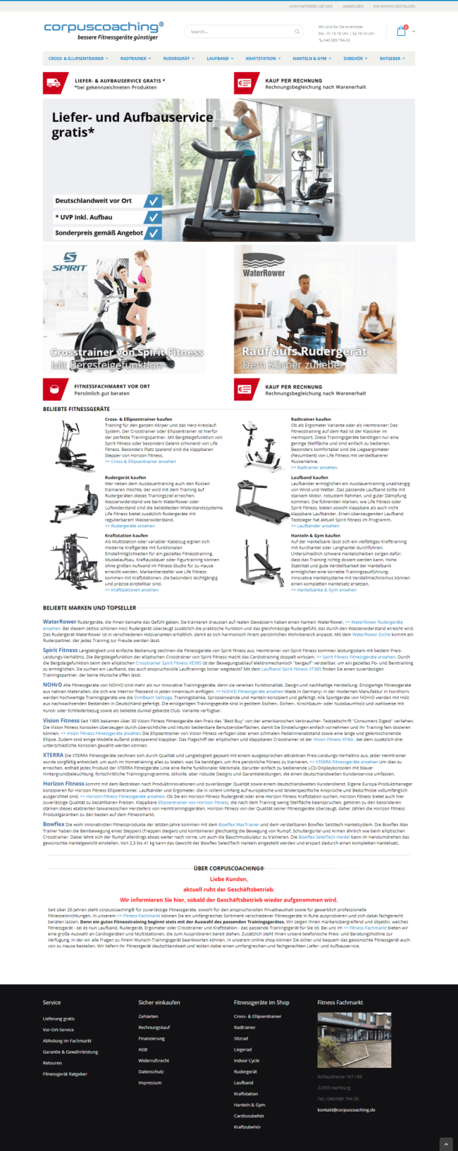 Corpus Coaching we created an online shop for fitness equipment and fitness accessories based on Magento 2 The aim was to present the high quality fitness products for the home area in a correspondingly valuable way and to bring the customer quickly to the desired product purchase using the new search function / menu navigation / navigation. The one page checkout with a variety of payment methods.