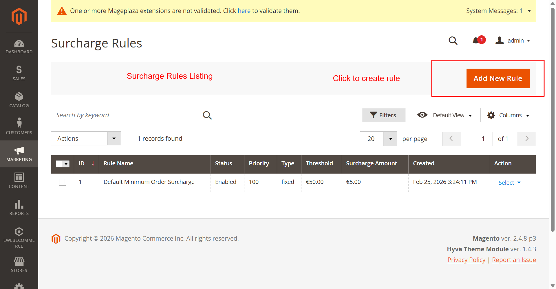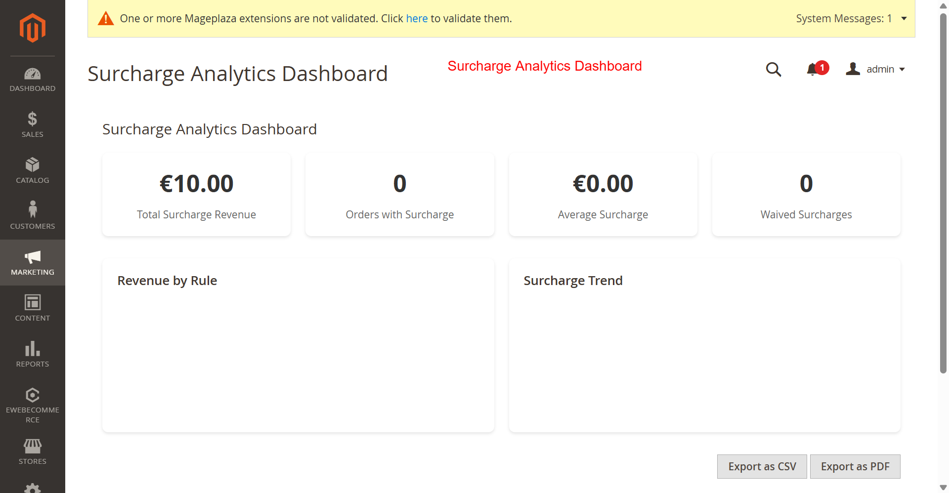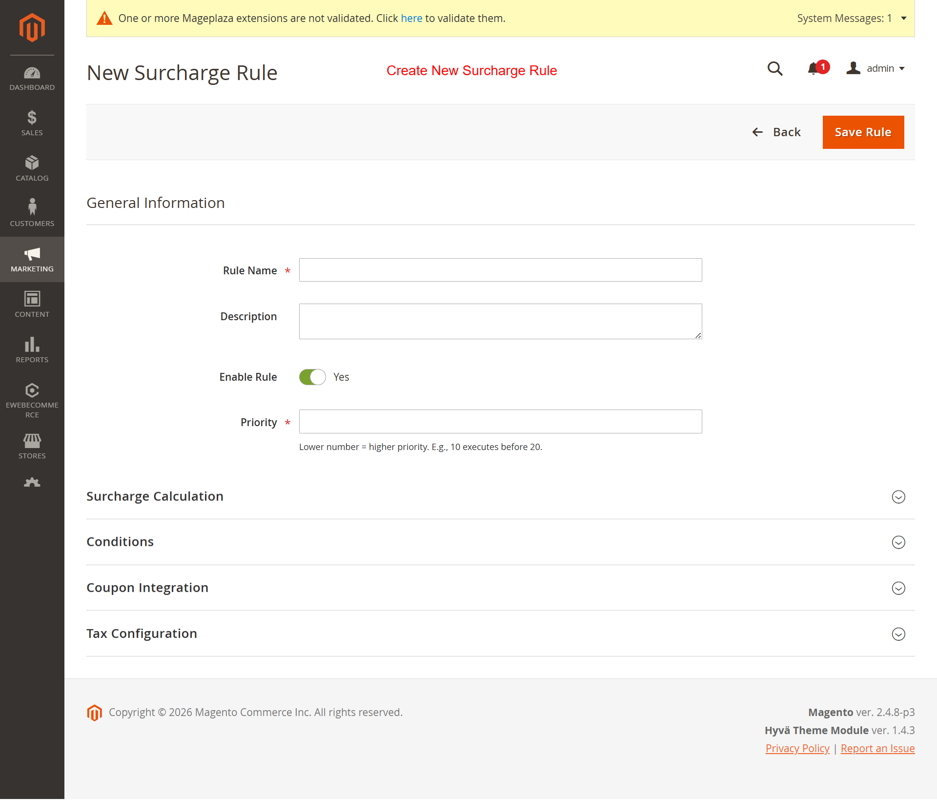 The extension offers a robust admin management panel with 13 fully-customizable pages dedicated to surcharge rule management. Admins can intuitively create, modify, and analyze rules to suit specific business needs.
